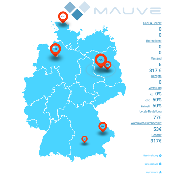 Bislang hat die MauveMap live und in Echtzeit die in rund 50 Prozent der Mauve ApoShops ausgelösten Bestellungen dargestellt, aufgeschlüsselt nach Anzahl der Bestellungen in Deutschland, Anzahl der Bestellungen aus dem Ausland, der Höhe der letzten aktuellen Bestellung in Euro und der gesamten Höhe aller Bestellungen seit dem Aufruf der Karte. Die neue MauveMap geht noch einen Schritt weiter und zergliedert die ausgelösten Bestellungen im Internet nach Zustellart (Click & Collect, Botendienst oder Versand), nach der Verteilung (RX, OTC, Freiwahl), gibt den Betrag der letzten Bestellung an, den durchschnittlichen Warenkorbumsatz und den Gesamtumsatz seit dem Start der Karte. Jedes Mal, wenn in einem Apotheken Webshop von Mauve eine Bestellung ausgelöst wird, zeichnet sich auf der Karte ein Kringel um den Ort des Bestellenden. In dem Kringel wird die Höhe der Bestellung abgerundet und inkl. MwSt. angezeigt.