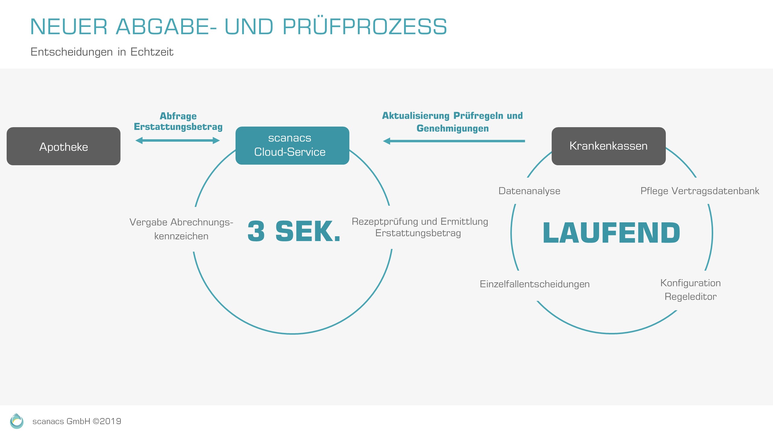scanacs hat eine Plattform mit einer unabhängigen Infrastruktur entwickelt, über die die Partner im Apothekenmarkt von scanacs entwickelte Anwendungen nutzen und datenschutzkonform Informationen austauschen können. Mit der Anwendung „Verordnungsprüfung“ erhält die Apotheke transparent und übersichtlich Hinweise zur Abgabe der verordneten Arzneimittel in Echtzeit. Herzstück der Verordnungsprüfung ist der von den teilnehmenden Krankenkassen konfigurierte Prüfkatalog. Ziel dieser Lösung ist es, den bis zu zwölf Monate dauernden und der Arzneimittelabgabe nachgelagerten Prüfprozess direkt in der Apotheke durchzuführen.