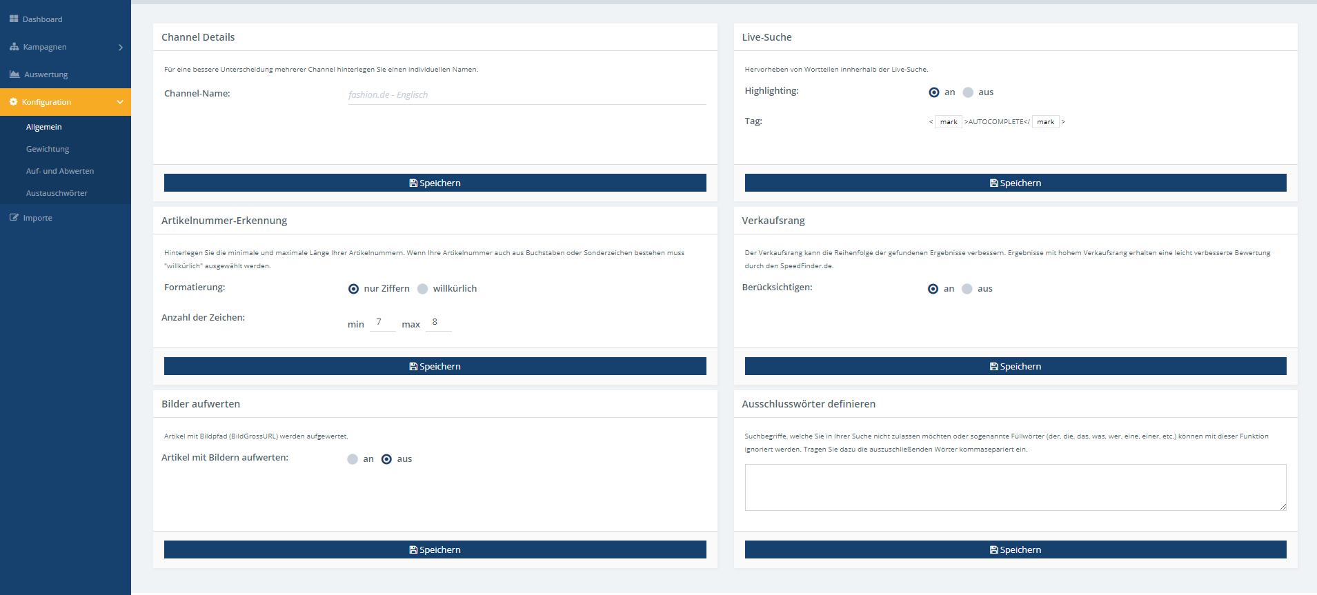 Im ebenfalls neu gestalteten Backend des SpeedFinders gibt ein übersichtliches Dashbord Auskunft über die wichtigsten Kennzahlen des SpeedFinders wie Suchanfragen und Top-Suchanfragen der letzten 7 Tage sowie beispielsweise Anzahl der Kampagnen, Artikel, den letzten Import und das Optimierungspotanzial. Detaillierte Informationen und umfangreiche Einstellungsmöglichkeiten verbergen sich hinter den Reitern Kampagne, Auswertung und Konfiguration in der linken Navigationsleiste.